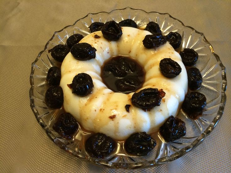 Coloque numa travessa cubra com ameixas em calda e leve para gelar.